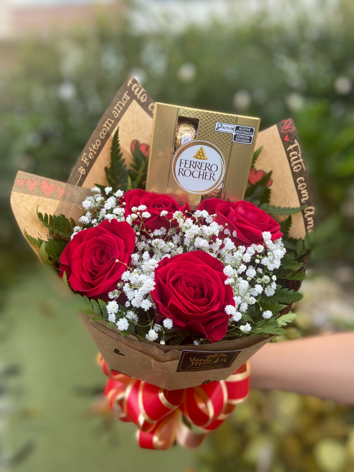 Lindo buquê com 4 Rosas Vermelhas Importadas e complementos com caixa de Ferrero Rocher 4 un.