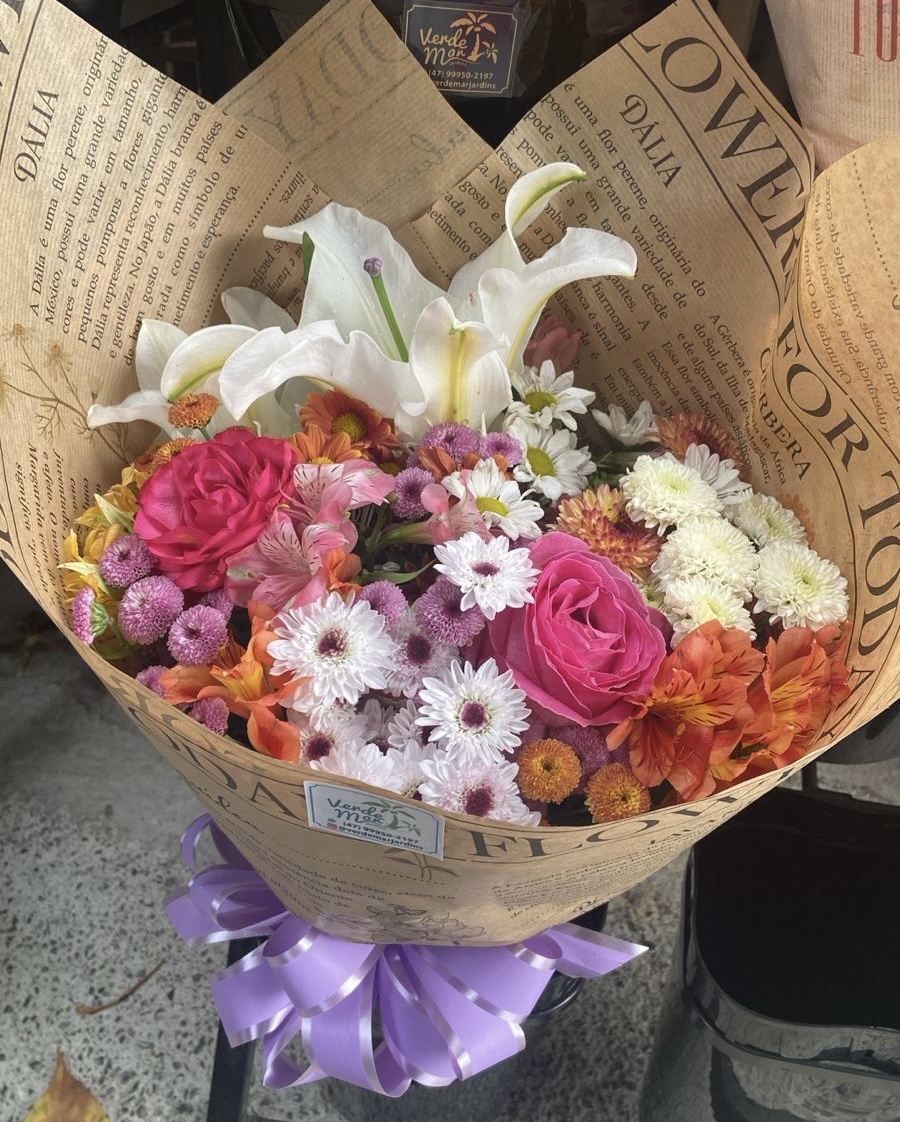 Vibrante buquê com uma mescla de flores do campo e lírio disponíveis no dia.